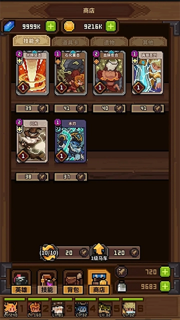 1、这款游戏本质上是玩法较为常规的数值卡牌类型,战斗环节加入了部分肉鸽机制——比如能在商店选购道具卡,也保留了经典的三选一属性强化环节。英雄自身的技能采用卡组配置模式,玩家可自由搭配组合,战斗时则随机抽取使用。不过,由于战斗支持自动进行,还能开启技能自动释放和多倍加速功能,原本的英雄技能卡牌设定便显得有些多余,最终体验和常规卡牌游戏并无太大差异。