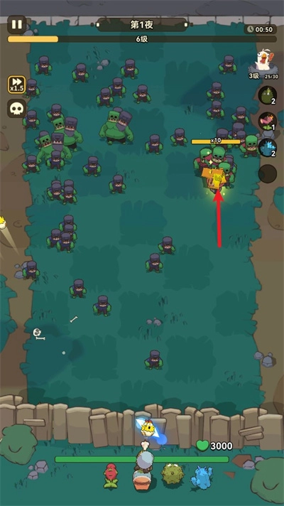 1、游戏开始时,会有一名角色首先发动攻击,击败僵尸能够积累经验值,进而逐步提高等级。