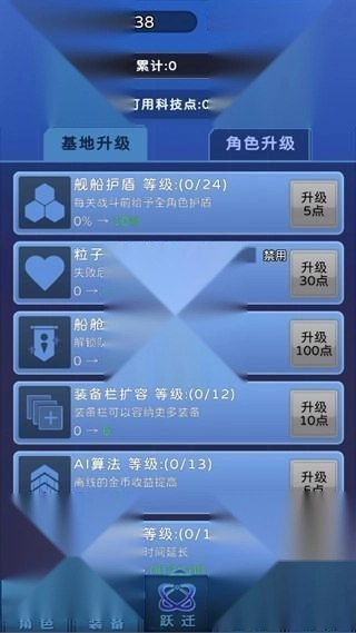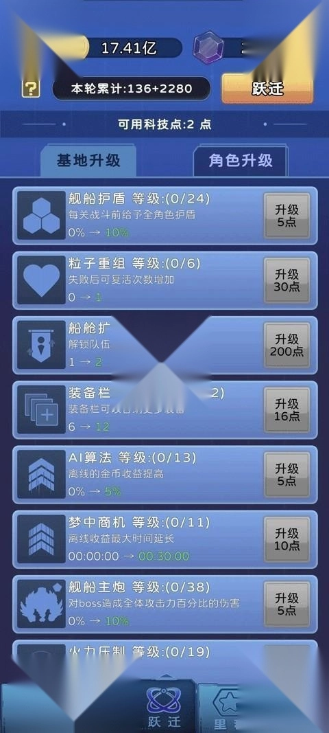9、跃迁完成后务必点选的内容:1.舰船主炮(具备自动牵引BOSS的功能);2.船舱扩容(可让上阵人数增加至5人,是必点选项);3.宇宙招聘书(使用后角色至少能提升到4星)。至于第二页的角色升级板块,随意点一些力量、攻速、剑术磨练相关的选项即可。