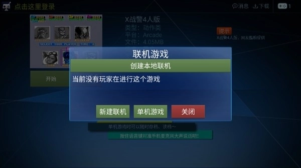 这是一款集成了街机、FC、MD、SFC等多种平台经典游戏的应用,包含射击、格斗、动作、策略、赛车、体育、益智和角色扮演八大游戏类别。它支持网络联机对战,玩家可以邀请好友一同在大屏电视上体验多人游戏的乐趣。若玩家没有实体游戏手柄,软件的虚拟触摸手柄功能也能满足操作需求。在“经典联机”模式下,主要提供各类家用机平台的游戏;而“网络对战”模式则以街机游戏为核心内容。