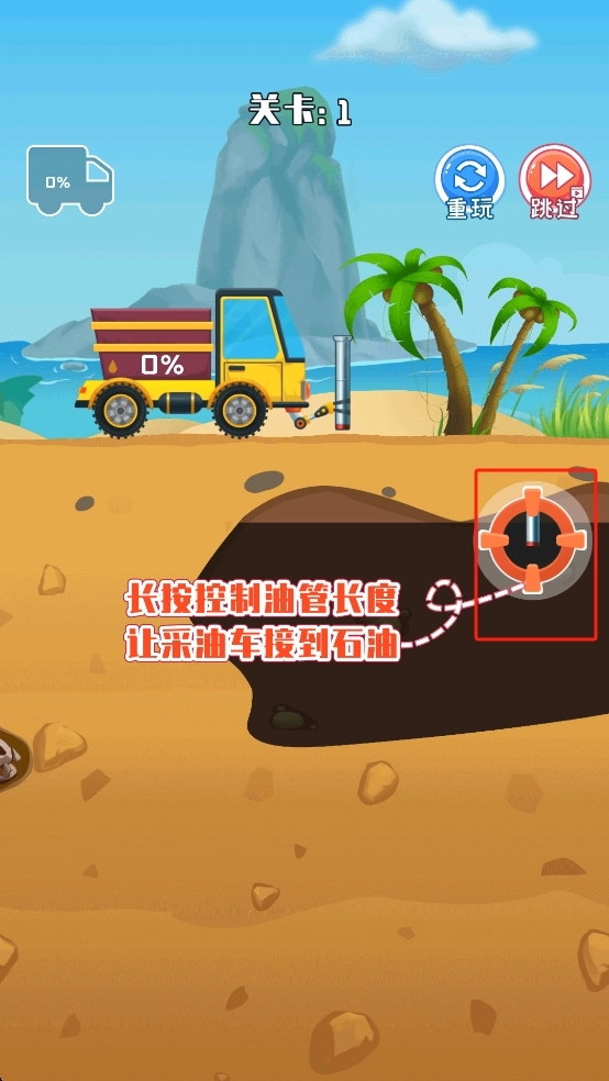 2、碰到石油坑时,长按右侧的控制按钮来调整油管长度,确保油管能精准对接石油坑和采油车,这样就能顺利完成石油采集了。