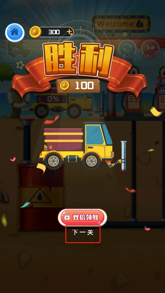 3、完成采油任务后,界面会显示胜利信息,此时点击屏幕下方的“下一关”按钮,就能进入新的关卡,继续挑战不同地形的采油任务。