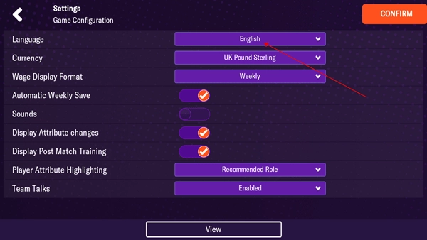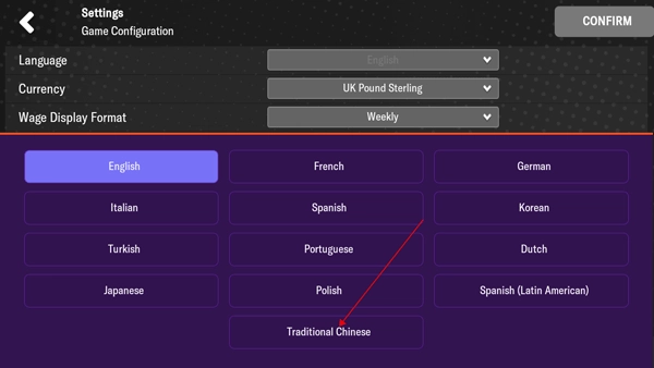 4、最后别忘记点击右上角的CONFIRM按钮来保存设置,这样操作完成后,游戏就会切换成中文了。