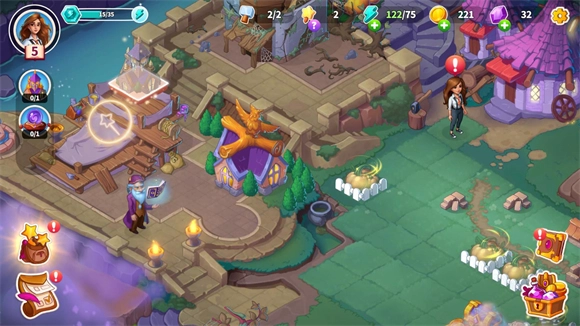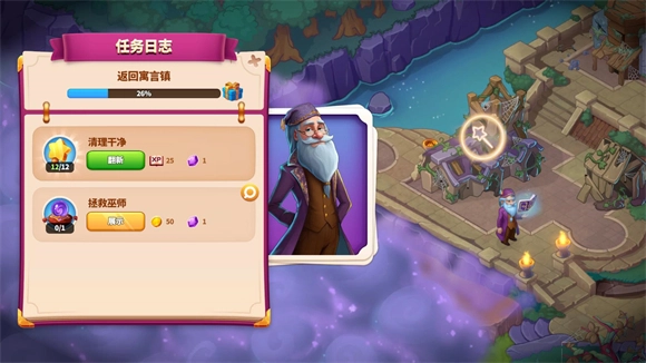 4、点击屏幕左侧的按钮可查看当前任务,消耗一定数量的魔法棒即可完成任务并修复建筑。