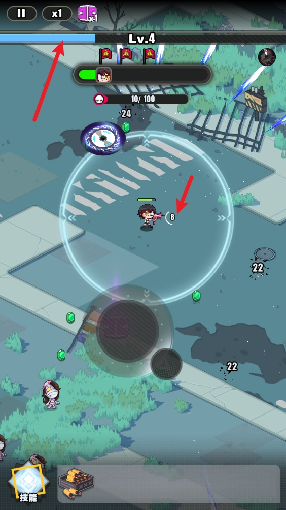 2、角色发射的子弹存在数量限制,用完后需要消耗时间换弹。击败敌人可获得经验值。