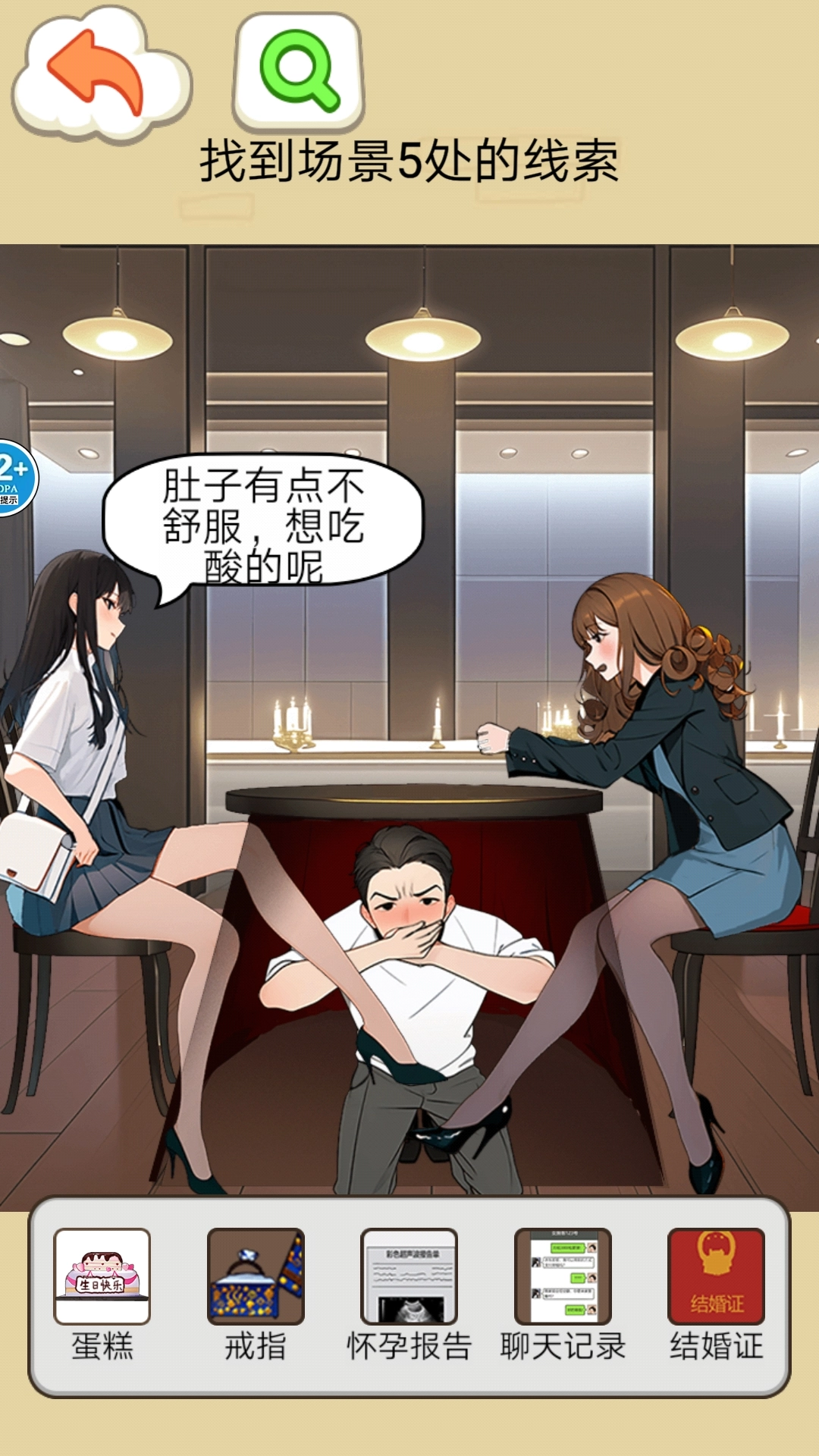 5、点击女主角腿部的结婚证书图标,每当找到正确线索时,就会触发剧情对话。