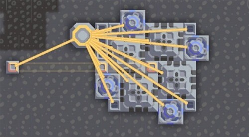若采集到铅矿,即可升级为2×2规格的分配器建筑,它能朝八个方向均匀输送弹药,从而彻底多炮塔的供弹难题。