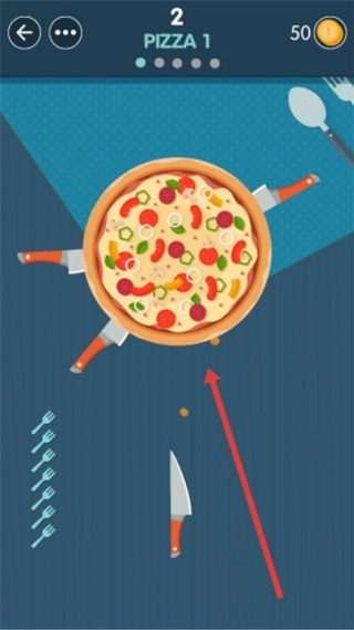 3、在关卡里,你需要操控刀具,顺着箭头所指的方向切割披萨,达成“PIZZA-1”的目标,以此获取积分,推动游戏进程。