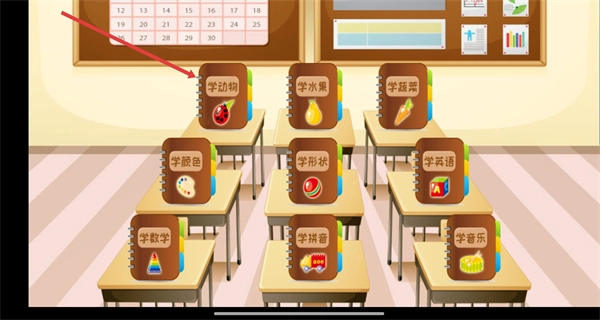2、进入教室场景,选择点击学动物笔记本,进入查看动物学习分类页。