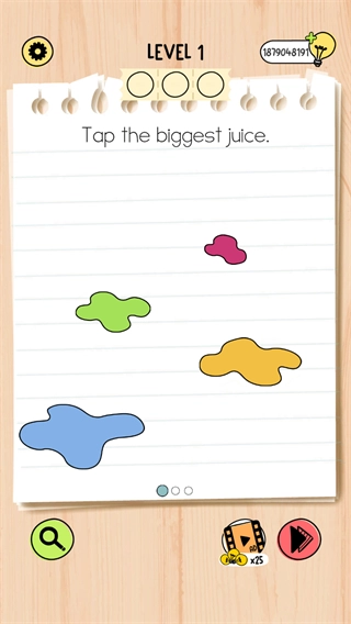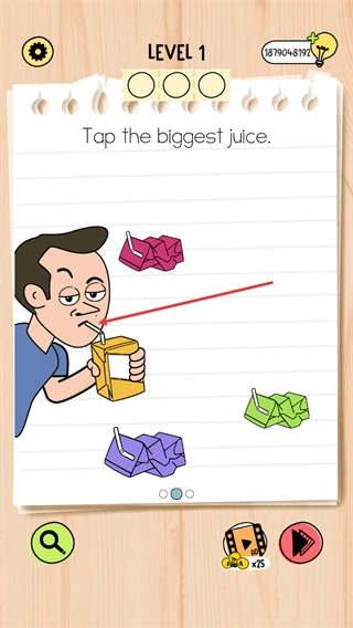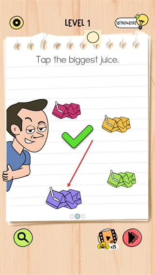 2、在第1关中将果汁给角色喝完后获取包装,观察界面中不同颜色的果汁包装,找到最大的那个,以此完成该步骤的操作。