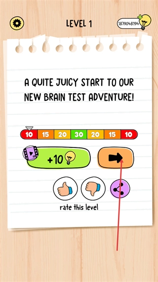 4、关卡完成后出现结算界面,点击橙色的箭头按钮,即可进入下一个关卡,继续参与新的脑力测试冒险任务。