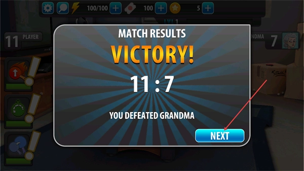4、对战胜利后出现MATCHRESULTS界面,显示以11:7击败GRANDMA,点击NEXT按钮,即可进入下一场赛事挑战。
