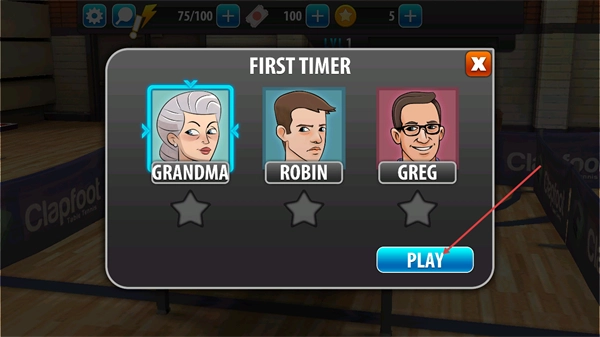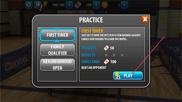 1、在PRACTICE界面中,选择FIRSTTIMER模式后,点击消耗25能量的PLAY按钮,即可进入该模式的对手选择环节。