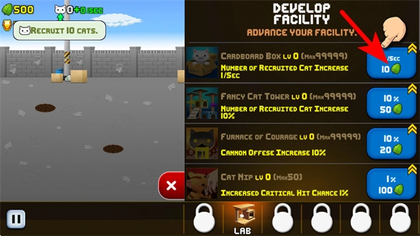 3、在设施界面中,点击Cardboard Box对应的升级按钮,提升猫咪的招募数量,扩充作战阵容。