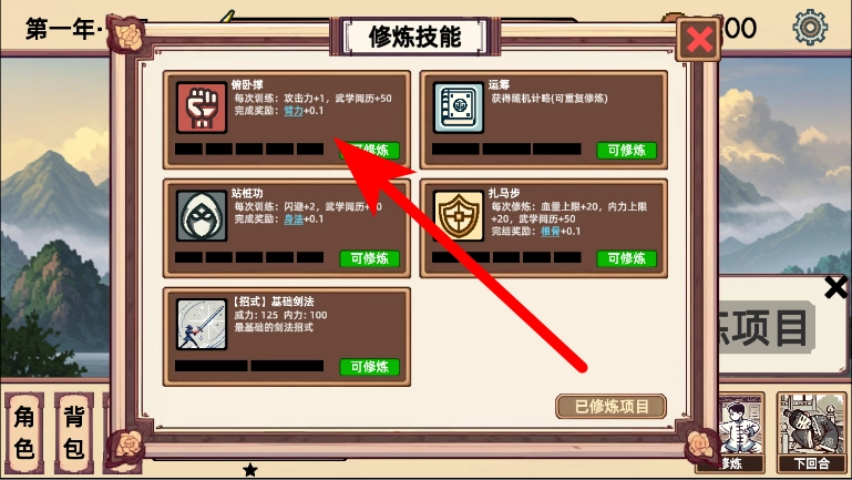 3、在修炼技能页面,选择要修炼的技能,点击对应修炼按钮。