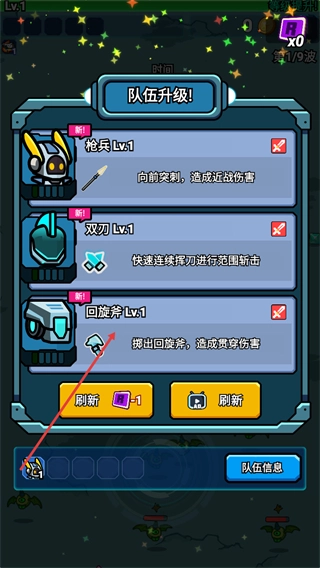2、触发队伍升级界面后,可选择如回旋斧Lv.1这类新单位加入队伍,该单位能掷出回旋斧造成贯穿伤害,搭配现有角色提升队伍输出能力。