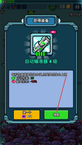 4、开启宝箱获得4级装备自动输液器时,点击领取按钮即可获取该装备。它具备每秒恢复英雄生命值的效果,但会降低生命上限,使用时需结合战斗需求合理搭配,以此提升英雄的生存能力。