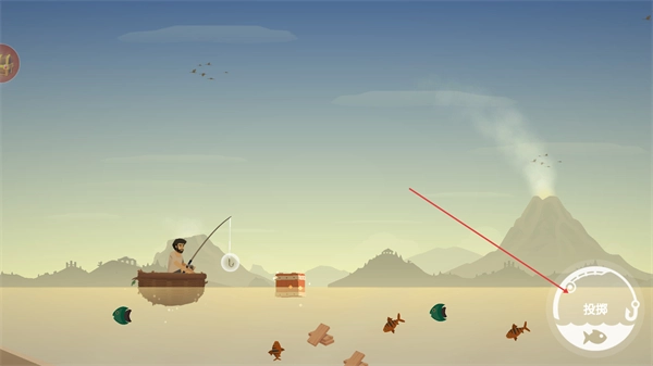 1、操控角色在船上钓鱼,点击投掷按钮抛竿,尝试钓取水中的鱼或物品,推进生存流程。