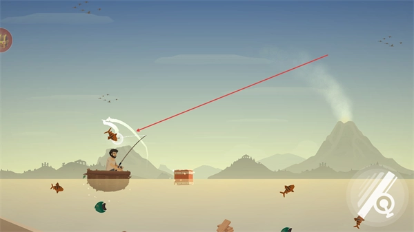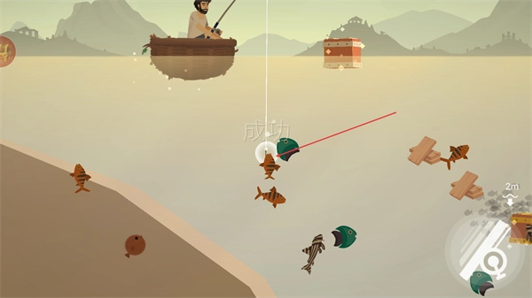 2、钓中目标鱼类后,完成垂钓操作,积累资源,同时收集水中的物品。