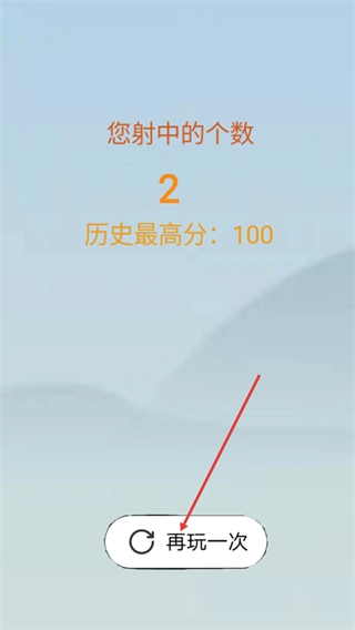 4、当结算界面显示射中个数后,点击再玩一次按钮可重新开始游戏,通过多次尝试熟悉目标分布规律,提升射中数量以挑战更高分数。