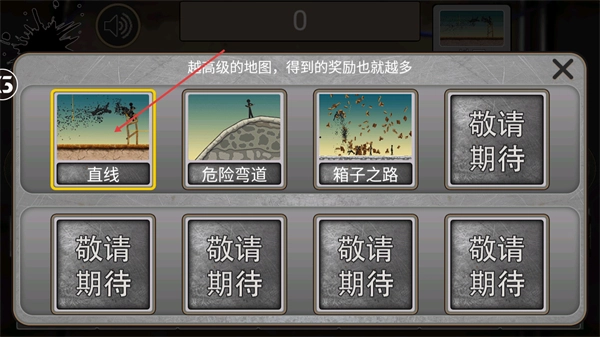 2、打开地图选择界面后,优先选择直线地图开始关卡,该地图难度较低适合初期体验,后续可解锁危险弯道、箱子之路等更高奖励的地图。