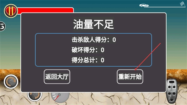 4、当出现油量不足的结算界面时,点击重新开始按钮可再次挑战关卡,挑战前可优化车辆部件配置,提升续航与行驶稳定性以获取更高得分。