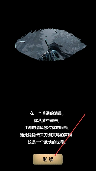 1、进入游戏初始剧情界面后,阅读武侠世界的背景介绍,点击继续按钮即可推进剧情,开启后续的角色创建与游戏流程。