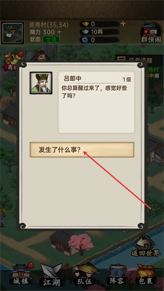 3、进入游戏后会触发与吕郎中的对话,点击发生了什么事选项,可推进剧情对话,了解当前场景的背景信息以解锁后续任务。