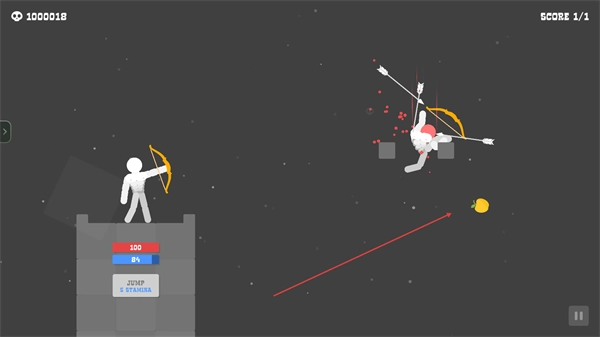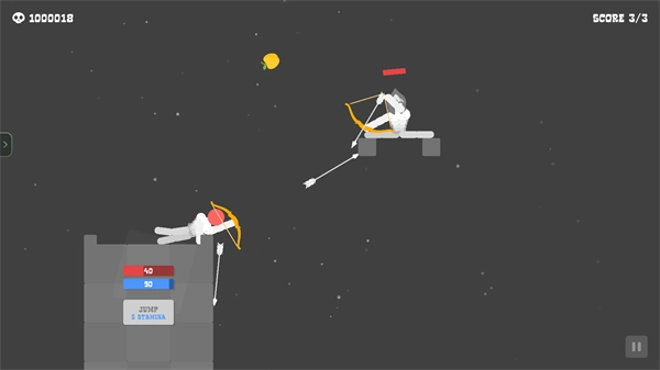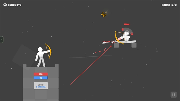 1、操控火柴人瞄准敌方弓箭手射箭,消耗其血量,积累得分。
