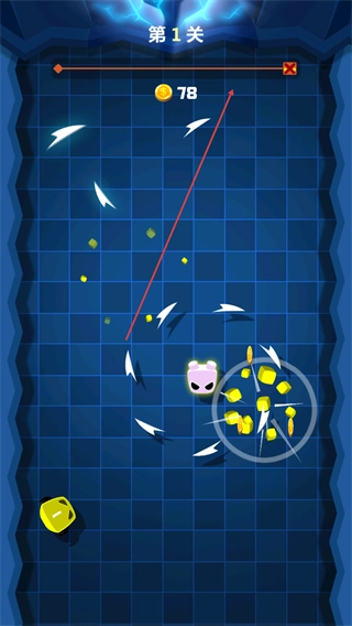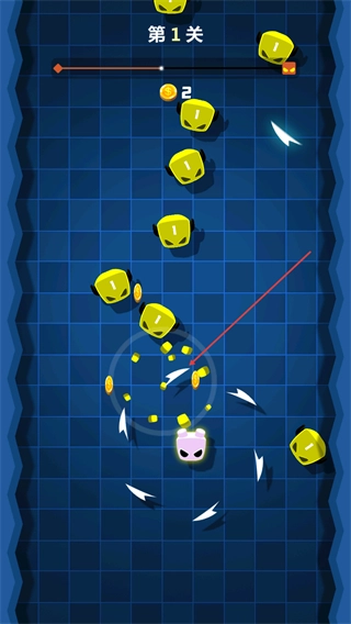 1、在第1关操控粉色角色旋转,撞击黄色数字块,收集金币,推进关卡进度。