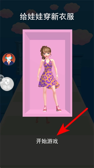 1、在启动界面点击开始游戏按钮,进入给娃娃穿新衣服的装扮闯关场景,开启换装冒险。