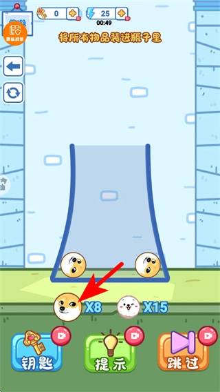 2、点击下方的物品如小狗形象道具,将其投递到上方的瓶子容器中,逐步完成物品收纳目标。