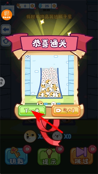 3、持续投递剩余物品,将所有道具如小猫形象道具全部装入瓶子,达成关卡的收纳要求。