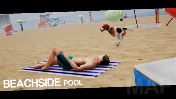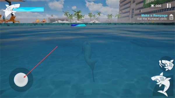 2、进入游戏后,通过左侧的操控按钮控制鲨鱼移动,当前任务是MakeaRampage,需在泳池区域移动鲨鱼,靠近目标人类以推进任务进度。