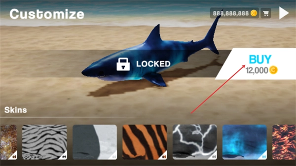 1、在Customize界面中,该鲨鱼皮肤处于LOCKED状态,点击右侧BUY按钮,消耗12000金币即可解锁该皮肤,也可选择下方其他皮肤样式进行更换。