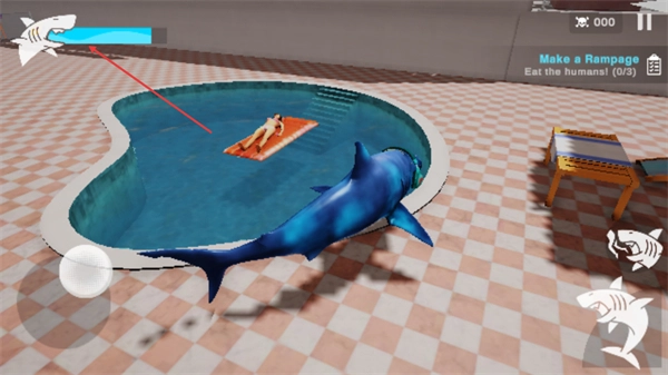 3、在游戏关卡中,操控鲨鱼靠近泳池内的人类,当鲨鱼在陆地上行动时,要注意左上角的氧气值,如果氧气值不足请及时回到水中。