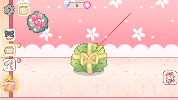 1、在该场景中,点击带有装饰的包裹类物品,可触发互动解锁新内容,界面左侧还有功能按钮,可辅助推进游戏内的装扮或收集类玩法。