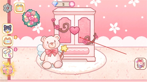 2、开启礼物盒后会获取到带有爱心装饰的柜子,会触发带有翅膀和魔法棒的小熊形象互动,这类互动是解锁游戏内装扮元素的方式之一。
