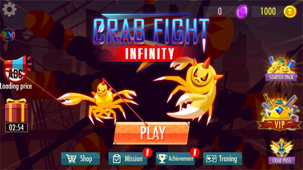 1、这是螃蟹大乱斗的主界面,点击PLAY按钮可进入游戏,界面还包含商店、任务等功能入口,助力玩家开启螃蟹战斗玩法。
