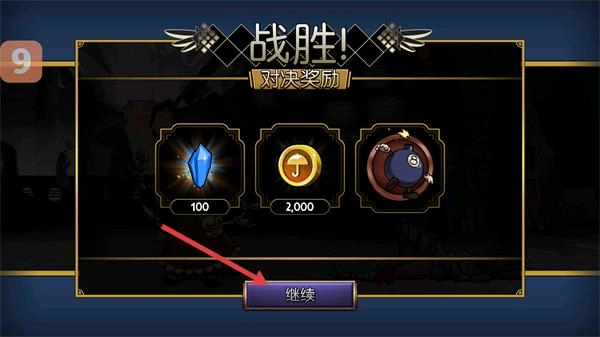 4、在对决奖励界面获取【100-钻石】【2000-金币】等道具后,点击【继续】按钮进入下一轮挑战。