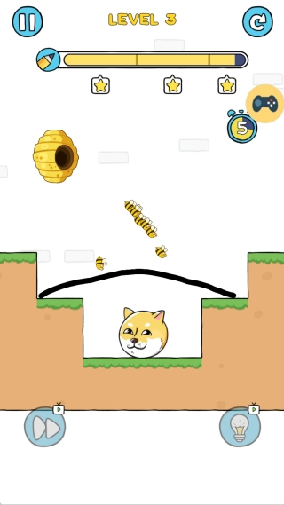 2、用手指在屏幕上自由画线,线条会实体化成为狗狗可行走的道路或阻挡蜜蜂的墙体,完成绘制后启动关卡。