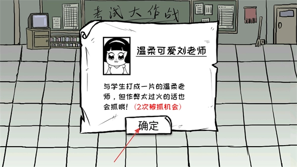 进入游戏后,查看老师的相关信息,得知温柔可爱的刘老师拥有2次抓作弊的机会,随后点击确定按钮。