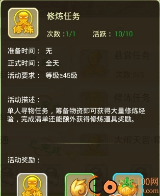 修炼任务:单人寻物任务,筹备物资即可获得大量修炼经验,完成清单还能额外获得修炼道具奖励。