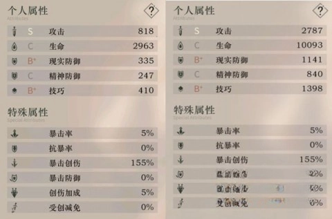 在属性对比上,左边展示的是1级角色的面板数据,右边呈现的则是30级洞悉状态下的面板情况。