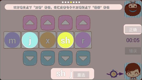 判定环节:组词完成后点击“正确”按钮确认,若所组词语不符合规则,则点击“错误”按钮。