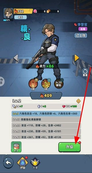 为李警官等角色进行升级,提升其攻击、防御等属性,以此增强战力、保障生存能力,同时丰富养成类玩法。