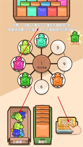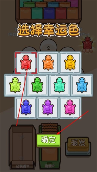 挑选幸运色的乌龟,点击确认后发放乌龟,进而触发相同颜色乌龟的消除机制。