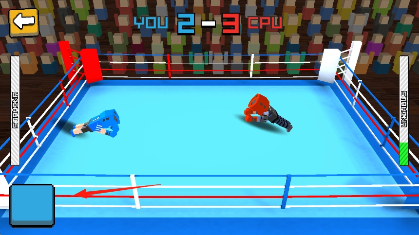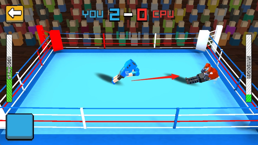 在设有围绳、坐满观众的拳击场上,操控分别为蓝色和红色的方块角色,借助左下角的虚拟按键,施展拳击、闪避动作来攻击对手。
