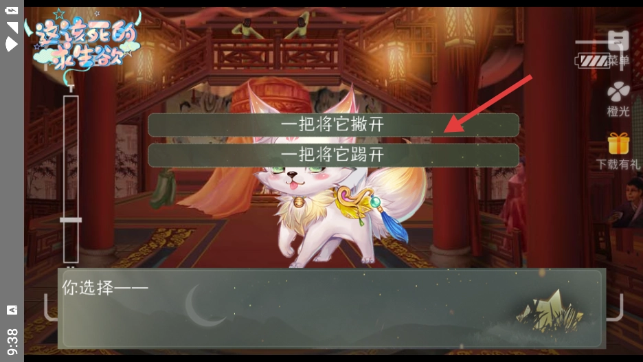 1、进入互动场景后,当灵宠出现时会呈现两个动作选项,选择点击“一把将它撇开”这一选项,即可触发对应的剧情发展,该选择会对角色与灵宠之间的关系走向产生影响;玩家通过这一操作,能够体验到不同的情节分支,进而感受到互动叙事所带来的独特趣味。