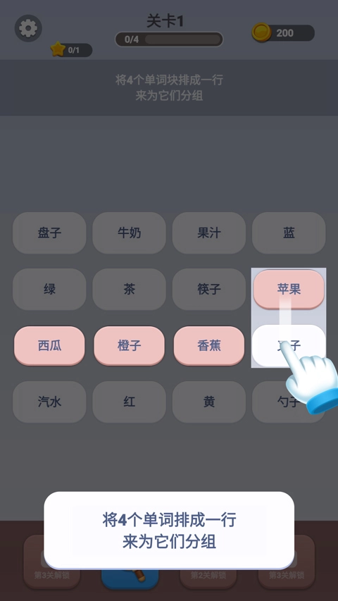 2、拖拽分组验答案:把词汇拖拽到对应的分组区域来完成分类,要是分类正确,词汇就会自动归到相应组别里,并且该组别会被点亮。